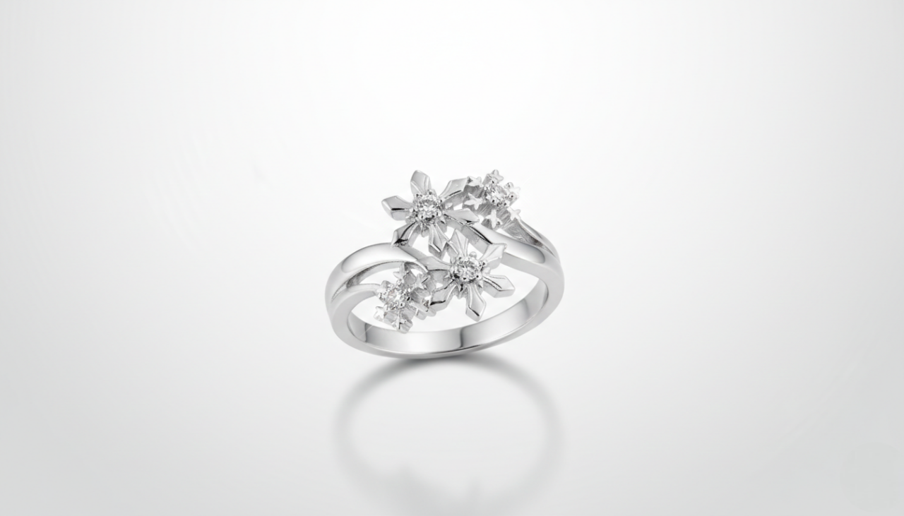 A refined silver-tone ring featuring sparkling snowflake florals, designed to capture light with graceful, timeless elegance.